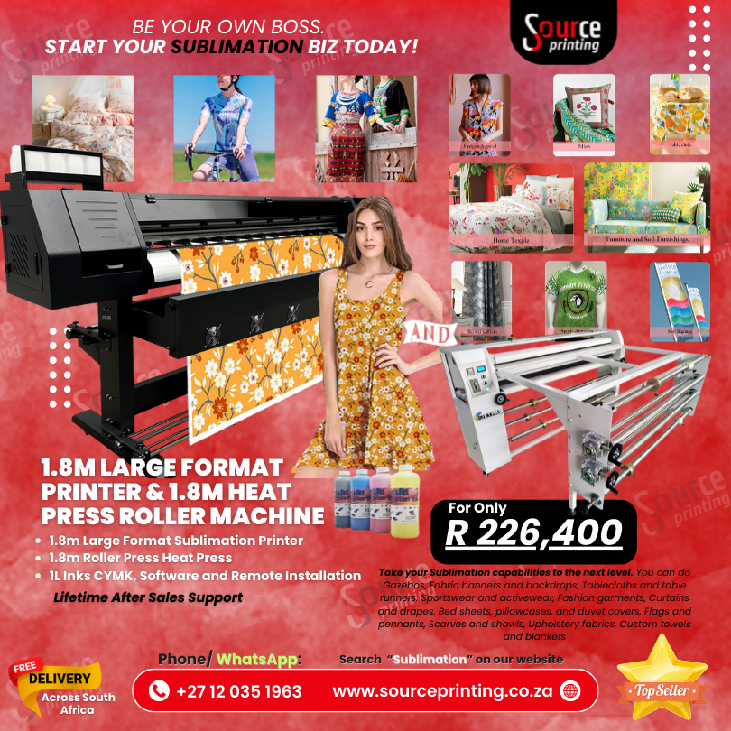 The bundle includes a 1.8 m large format sublimation printer paired with a 1.8 m roller heat press, giving you full control from printing to heat transfer. With included CMYK sublimation inks, software setup, and remote installation, you can begin production immediately with expert guidance.