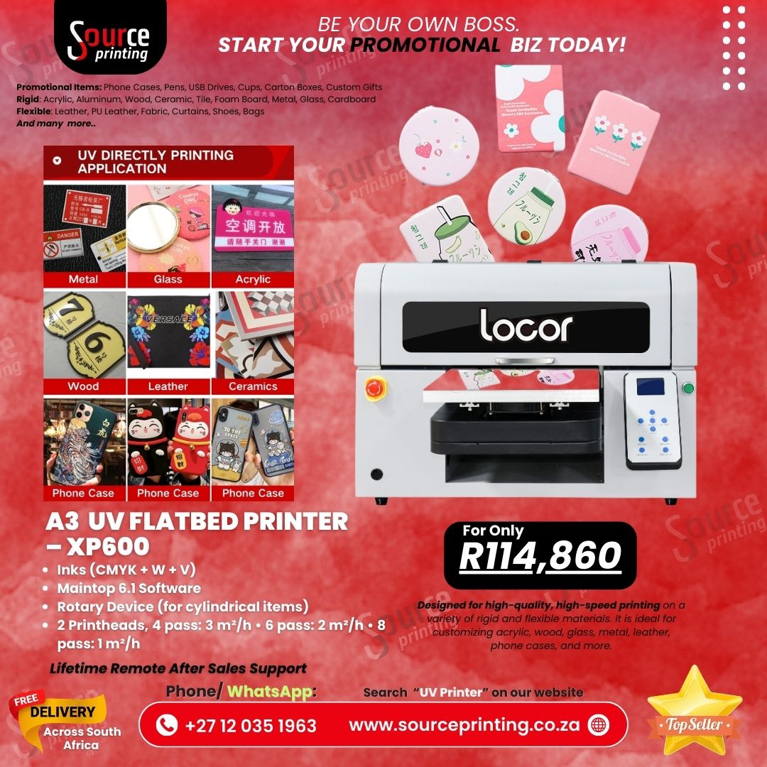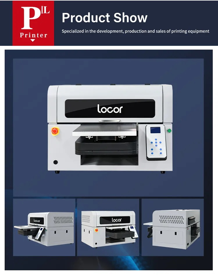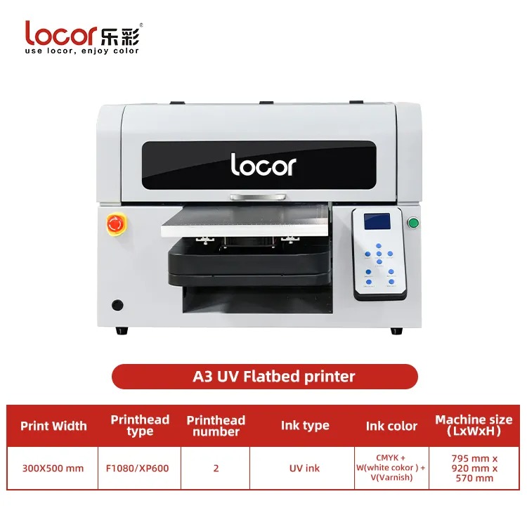 The Locor A3 UV Flatbed Printer is a compact yet powerful multifunctional UV printing machine designed for high-precision direct printing on rigid and flexible materials. With advanced UV LED curing technology and dual print heads (F1080/XP600), this printer delivers vibrant full-color output with white and varnish effects — perfect for customization businesses, advertising production, promotional items, and small-scale industrial printing.